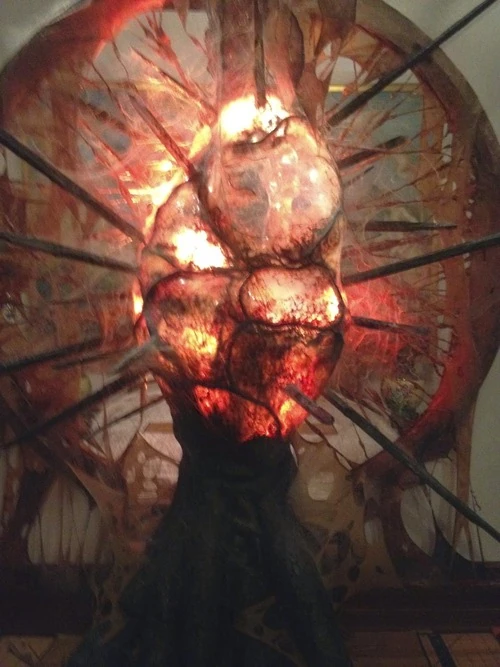 The cocoon appears to have a soft golden glow, its skin having yellow and red splotches, with translucent patches, and black spikes on its outer skin. It attaches to the walls nearby with a weblike substance.